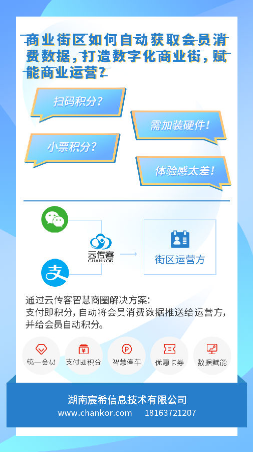 围绕着会员功能,购物中心在积分上都下了不少功夫,要么推行一收银难,要么众多消费者因为积分方式的不便捷性,往往懒得去动手。云传客自主研发的实体商业街会员一体化平台(智慧商圈)接入“支付即积分”功能,让消费者可通过微信支付和支付宝消费能快速积分,商户、运营者、消费者的三方连接得以实现。