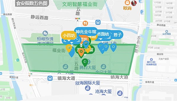 一街一图,将街区内餐饮服务单位全部纳入“五色码”管理范围,用“绿、蓝、黄、橙、黑”五种颜色区分从低到高五种安全指数级别,由“五色码”绘成该街区的专属“五色图”,方便消费者实时查询。